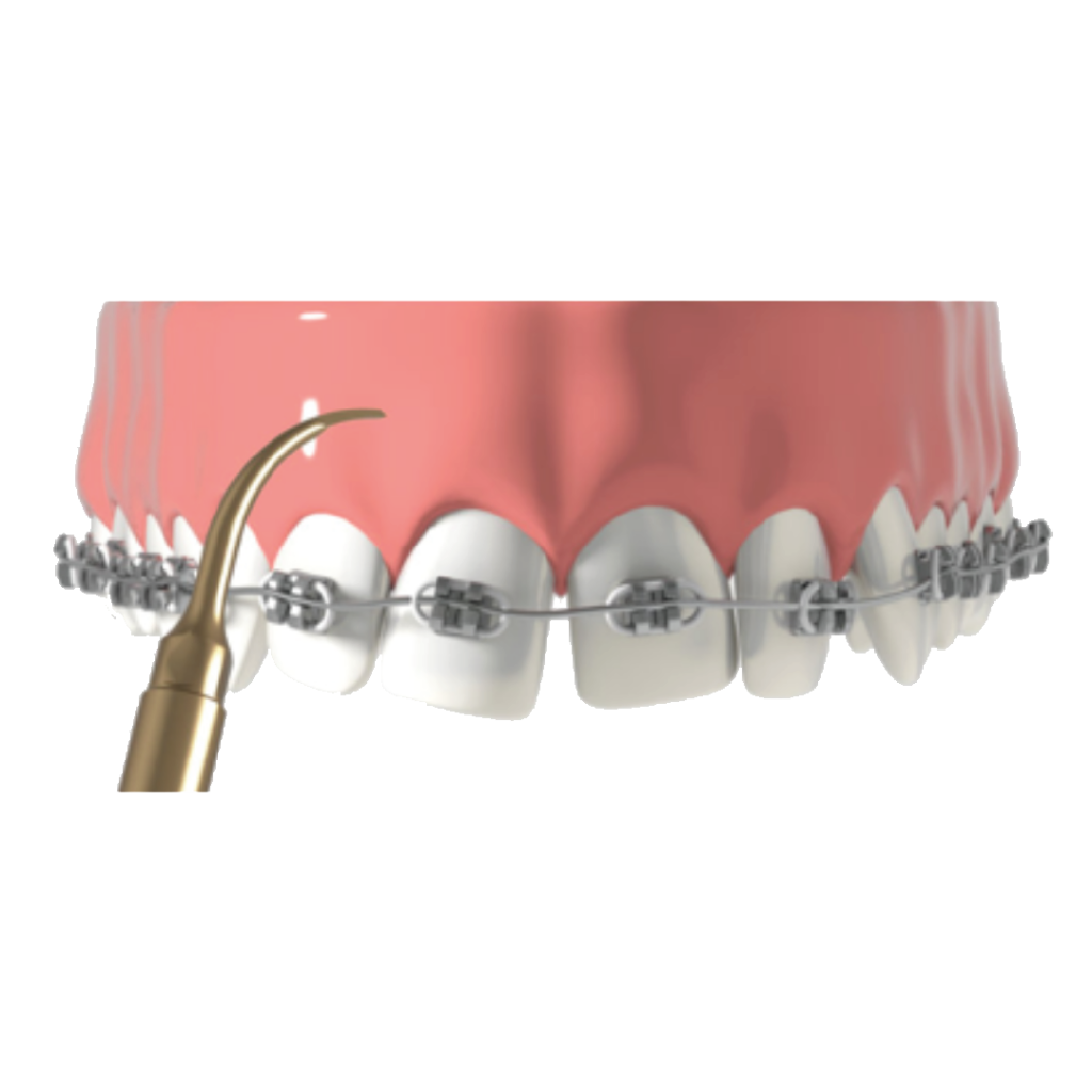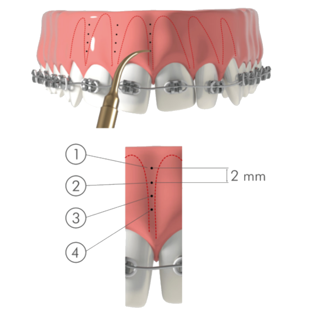 Realiza 3 o 4 micro-punciones ultrasónicas con el inserto PROrthodontics entre cada diente a movilizar, con una separación de 2 mm entre ellas, Evita raíces y estructuras anatómicas como nervios y arterias.