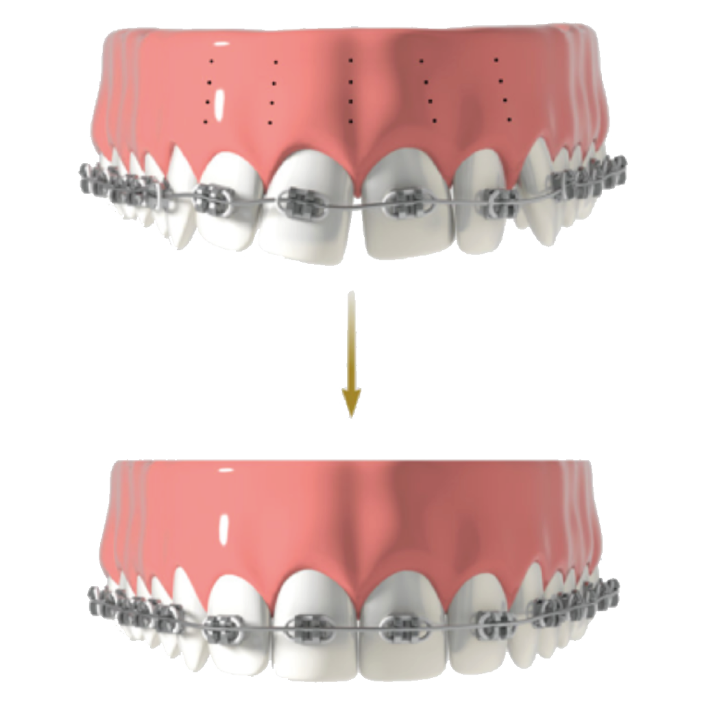 Acelera los tratamientos de ortodoncia, con mínimo trauma, sin necesidad de desprender la encía del hueso. Evita lesionar las piezas dentarias, las suturas y periodos de convalecencia postoperatoria, permitiendo al paciente funcionar normalmente luego de la intervención.